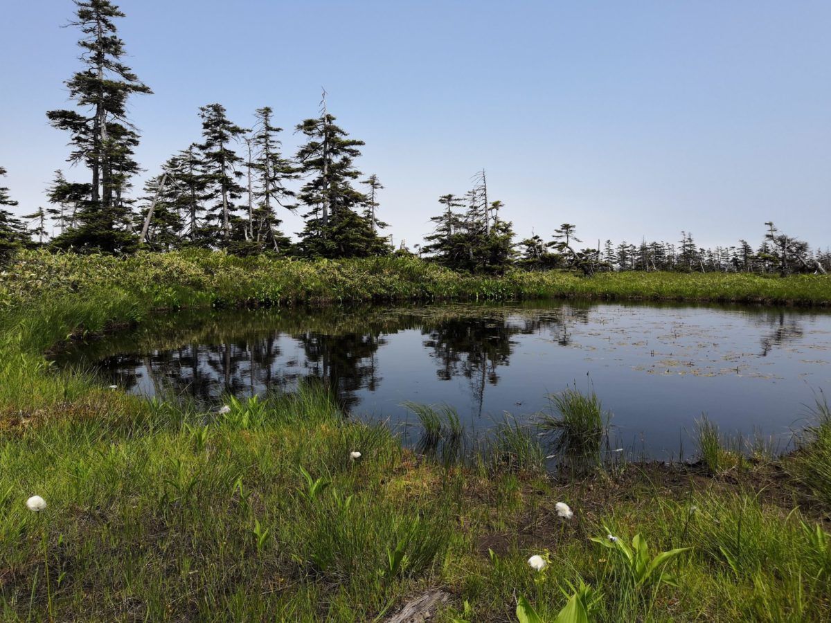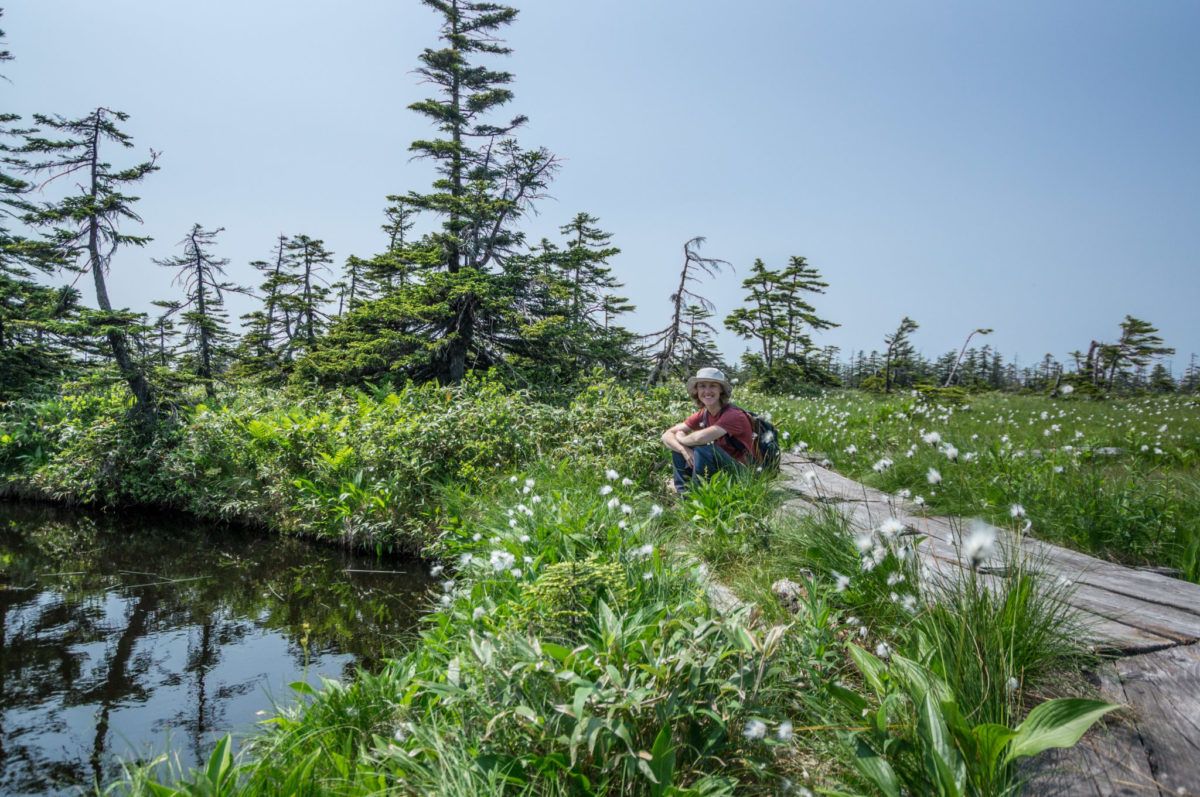 La végétation témoigne ici des conditions hivernales rudes que subit le sommet du mont, les conifères poussent bas et peu touffus. Nous faisons le tour, admirons les fleurs qui ressemblent à du coton et volent au vent, nous asseyons au bord d’une des petites mares pour déjeuner et regarder les nuages se refléter dans l’eau.