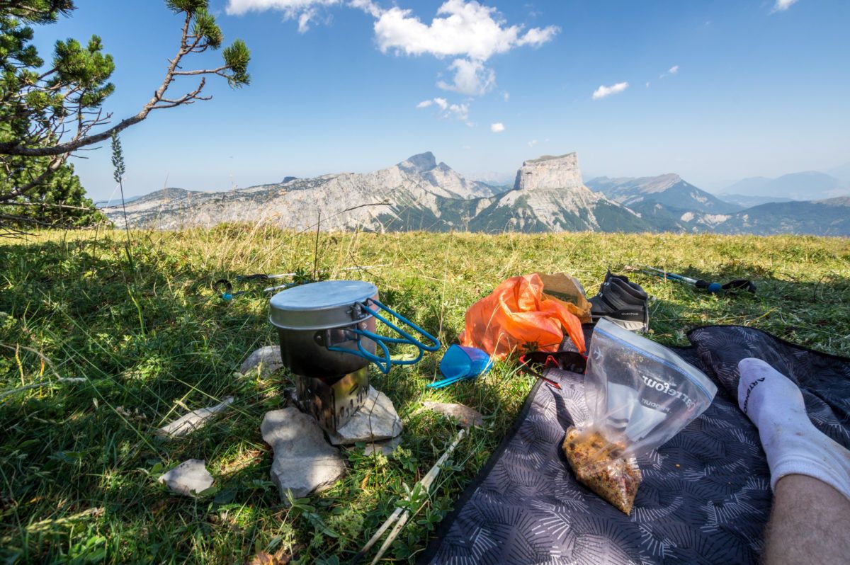 C’est ici que nous décidons de manger, à l’abri des arbres, au bord de la falaise. C’est la vue la plus directe sur le Mont Aiguille que nous ayons trouvé sur ce parcours.