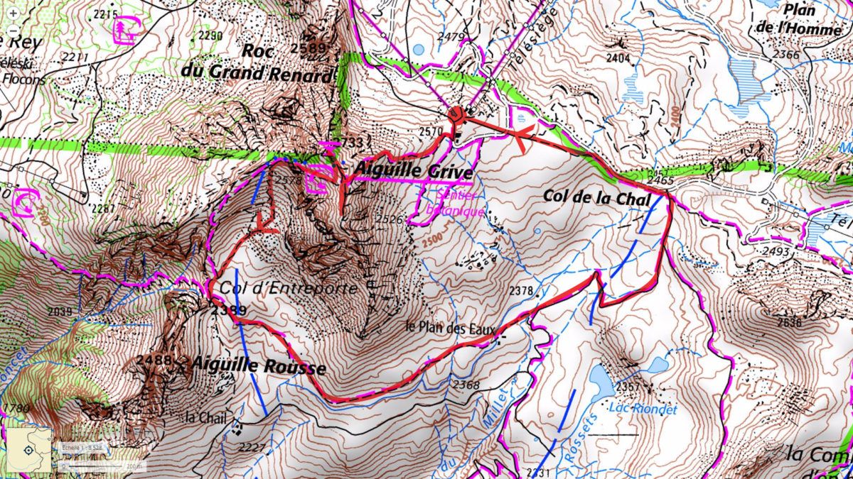 Nous surplombons l’Aiguille Rousse (centre-bas du panorama), en vrai c’est assez impressionnant. (ça donne le vertige)