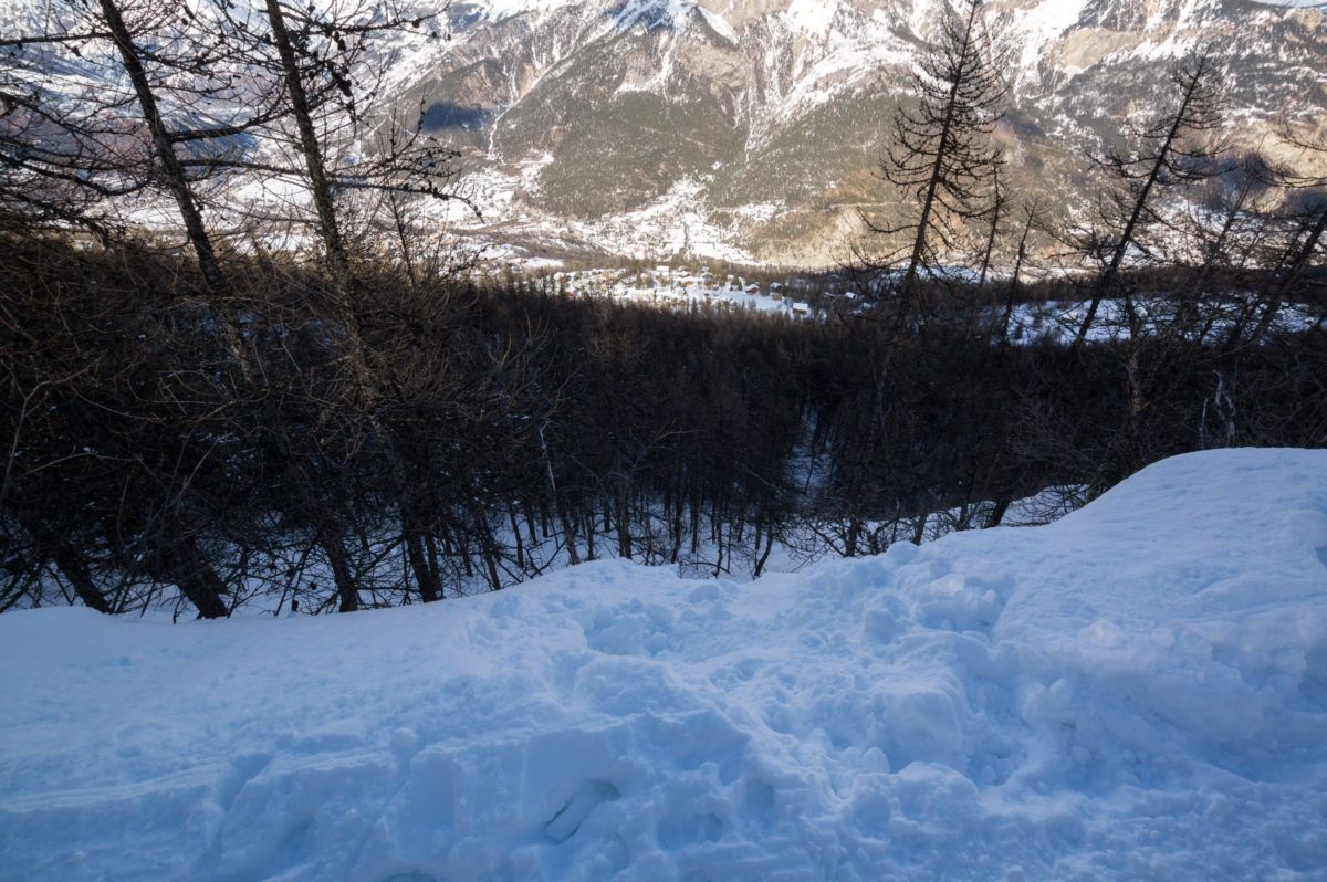 La voie se ressert et monte assez raide sur quelques mètres, les raquettes s’avèrent utiles. Le chemin sert également à la descente, les randonneurs sans raquettes se laissent d’ailleurs glisser et lustrent le passage, le rendant glissant. Une fois passée, la vallée se dévoile à travers les arbres.