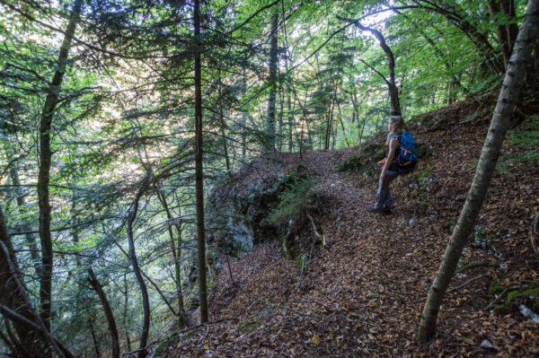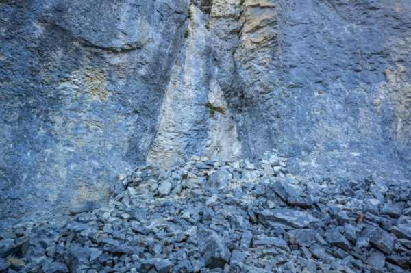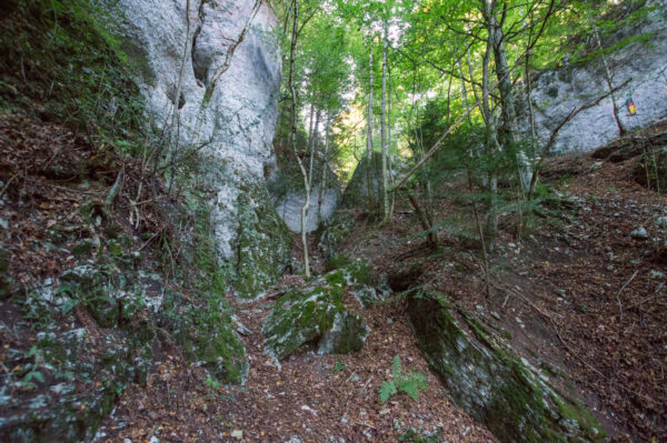 Le décors se transforme, la forêt s’éclaircit et la roche se fait plus apparente. De nombreuses pierres s’entassent au bord du chemin, et il est facile d’imaginer d’où elles viennent en levant les yeux.
