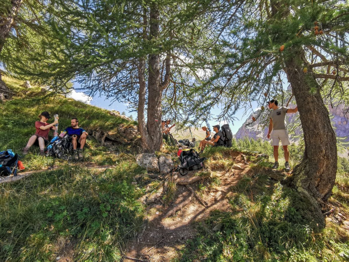 Nous faisons un petit arrêt au premier replat, où j’en profite pour expliquer la suite du topo, trouver l’étape de ce soir et partager mes quelques inquiétudes concernant l’eau au reste du groupe.