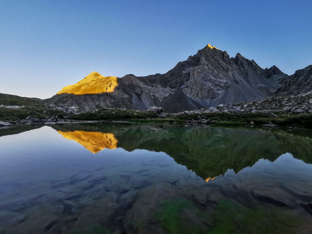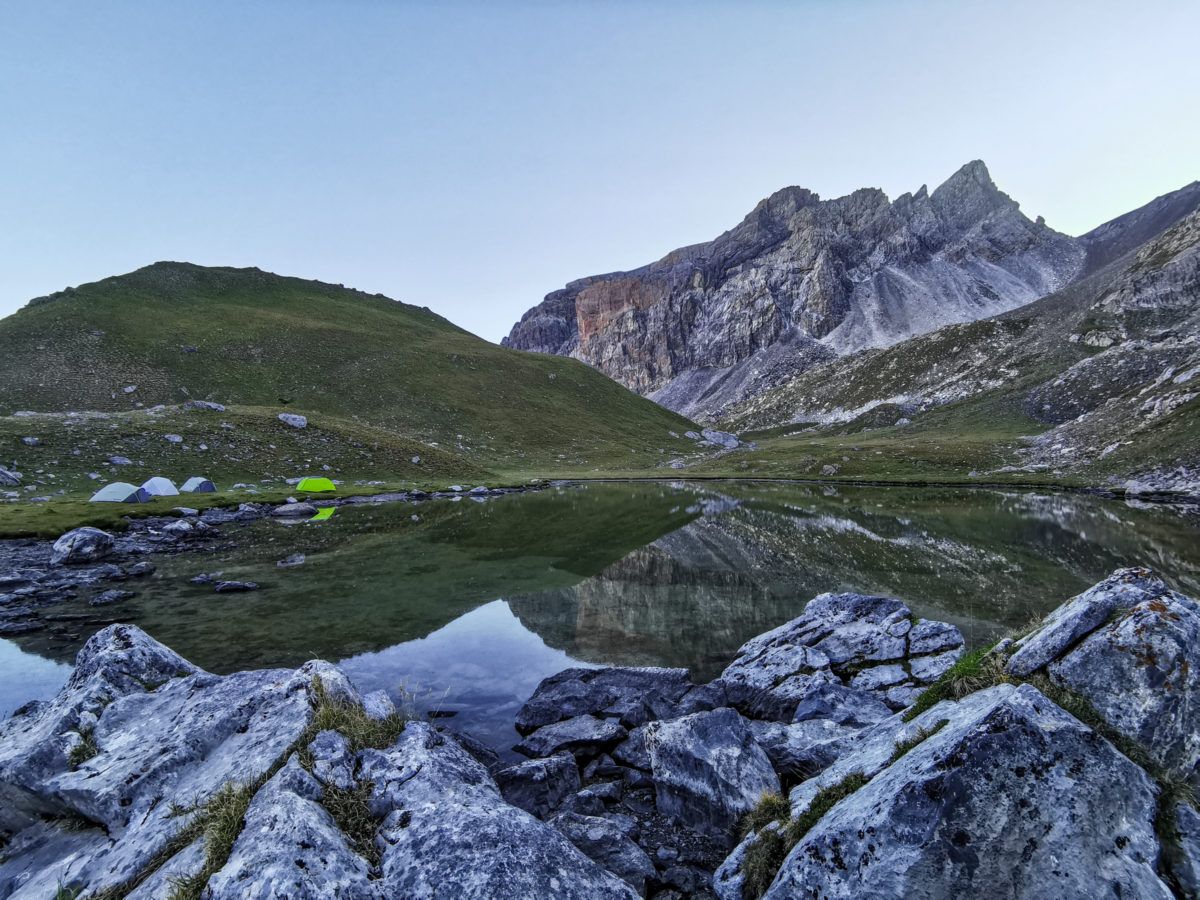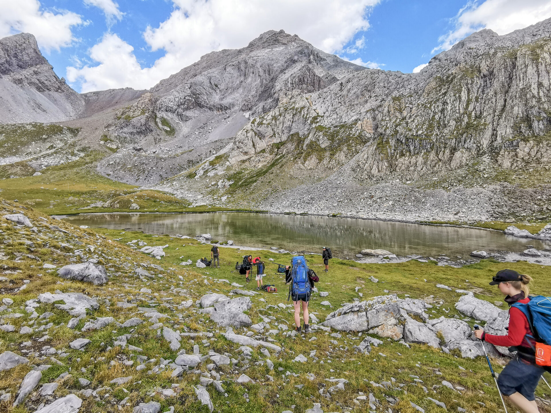C’est l’heure de se poser autour du lac, nous attendons encore un moment avant de poser les tentes. D’autres randonneurs commencent à arriver pour bivouaquer, chacun prend un « coin » du lac. Au moment de planter les tentes, un coup de vent emporte une de nos tentes non « sardinée », directement dans le lac ! Celle-ci roule-boule sur l’eau et se retrouve coincé de l’autre côté du lac… Plus de peur que de mal ! Bon il faut quand même la sécher un peu et nettoyer la vase, pas cool. Et mais, ne serait-ce pas l’heure de l’apéro ?