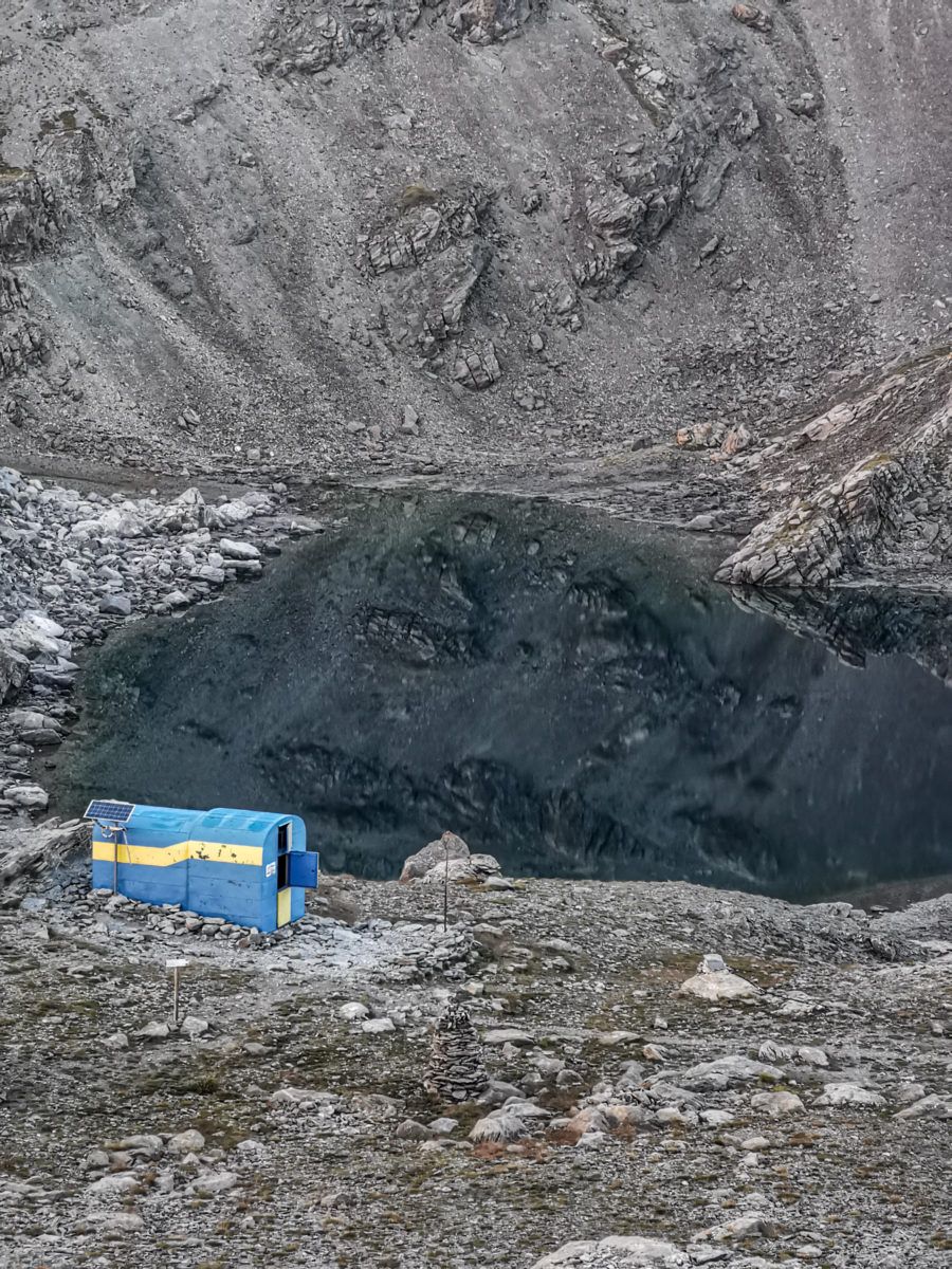 300 D- et 300 D+ après, nous voici au lac, avec son refuge caractéristique; une cabane bleu et jaune, avec 9 couchages superposés et un sas d’entrée avec une table repliable.