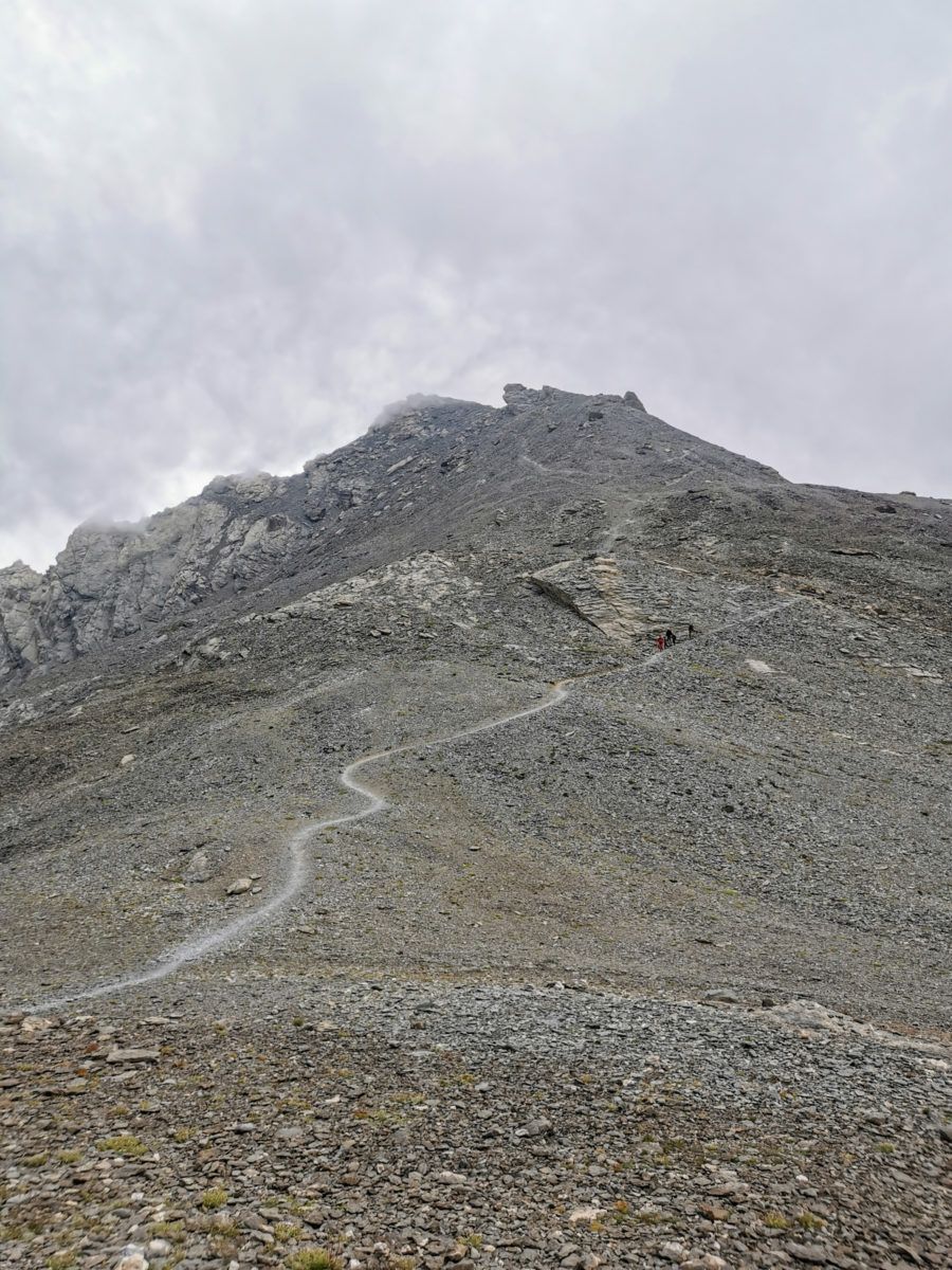 Une fois le col franchi, nous rejoignons le Lac de Vallonet, et nous commençons l’ascension du Col de Stroppia. D’en bas, nous pensions que le chemin passait sur la droite et que nous ne le voyions pas, mais que nenni. Le chemin a en fait été emporté par une coulée d’argile / pierres, et il va falloir se frayer un chemin là dedans ! Heureusement le sol est sec, l’argile est solidifié et cela ne glisse pas trop, mais ça grimpe fort !