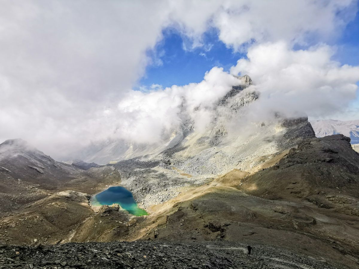 Notre groupe réduit se motive pour y grimper quand même, « c’est quand même le plus haut sommet du trek » (3151 m) ! Nous laissons nos sacs en bas pour être plus légers. Aux trois quarts de la montée, nous entrons dans les nuages, mais avant, nous prenons le temps de nous retourner pour prendre quelques clichés !