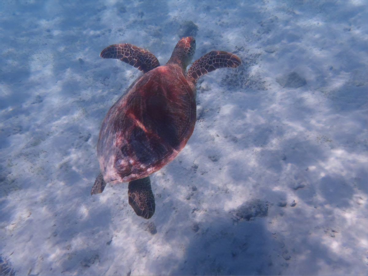 Les tortues ont l’air habituées et continuent leur repas malgré la présence de nageurs. Il est bien sûr interdit de les toucher.